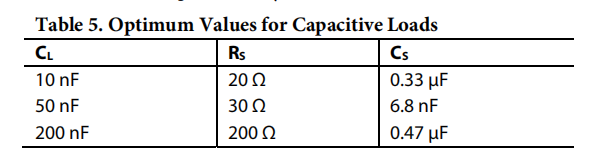 表5列出了几种电容性负载(最大200 nF)的RS和CS的最佳值。其他电容性负载的值可以通过实验确定。