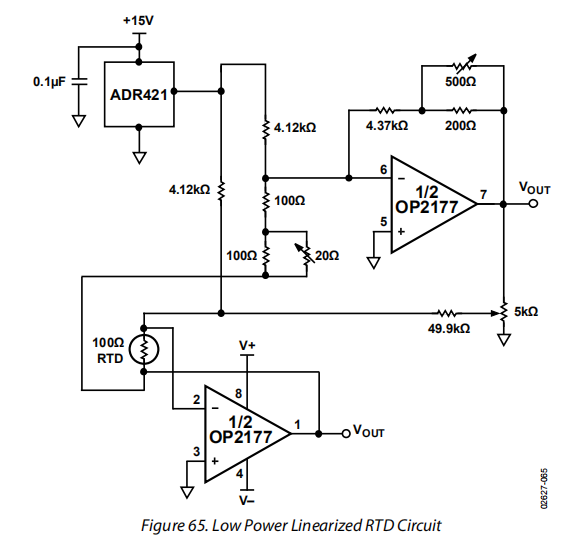 OP1177的低输入偏移电压漂移使其对于用于RTD信号调理的桥式放大器电路非常有效。与仪表放大器相比,使用单桥运算放大器通常更经济。
