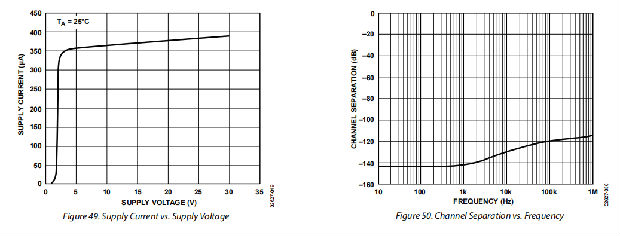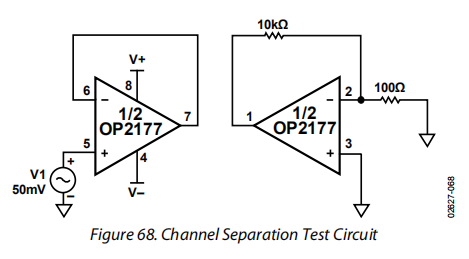 通常需要在单个芯片上使用多个放大器来拒绝来自相邻通道的输入或输出的任何信号。OP2177输入和偏置电路设计用于防止信号从一个放大器通道到另一个通道的馈通。因此,OP2177具有令人印象深刻的信道间隔,频率高达100kHz时大于−120dB,信号高达1MHz时大于−115dB。