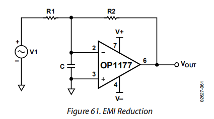 在OPx177低输入偏置电流小于1毫安的情况下,将一个5千欧电阻器与两个输入串联,可使输入偏置电压增加不到5微伏,对电路整体噪声性能的影响可以忽略不计。