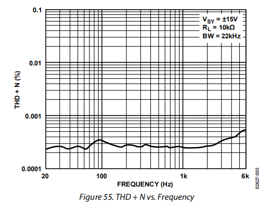 图55显示OPx177在单位增益中有大约0.00025%的失真,这是失真的最坏配置。