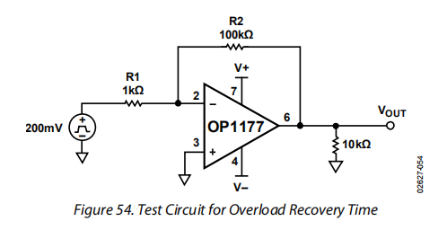 过载恢复是指放大器的输出电压从饱和状态恢复到线性响应区域所需的时间。一个常见的例子是电路传递函数要求的输出电压超出放大器的最大输出电压能力。在闭合环路增益为2的放大器上施加的10 V输入需要20 V的输出电压。这超出了OPx177在±15 V电源下工作时的输出电压范围,并迫使输出饱和。