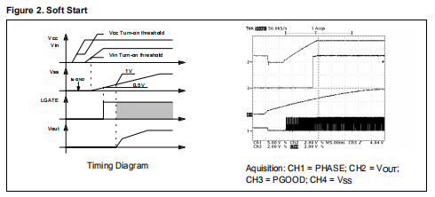 当软启动电容器(VSS)上的电压达到0.5V时,低功率MOS被导通至dis 给输出电容充电。当VSS达到1V(即振荡器三角波的下限)时,上限MOS开始开关,输出电压开始增加。VSS增长电压最初钳制误差放大器的输出,因此VOUT线性增加,如图2所示。在这个阶段,系统以开环的方式工作。当VSS等于VCOMP时松开误差放大器输出端的钳位。在任何情况下,误差放大器输入端的另一个箝位保持激活状态,允许VOUT以较低的斜率增长(即VSS电压的斜率,见图2)。在第二阶段,系统以闭环方式工作,参考值不断增加。当输出电压达到所需的值VPROG,以及误差放大器输入上的箝位被移除,软启动完成。Vss增加到最大值约为4V。如果VCC和OCSET引脚同时存在,软启动将不会发生,并且相关引脚内部对地短路不超过自己的启动阈值。在正常运行期间,如果在其中一个两个电源中,SS引脚内部对GND短路,因此SS电容器迅速放电。器件进入抑制状态,迫使SS引脚低于0.4V。在这种情况下,两个外部MOSFET保持不变关闭。