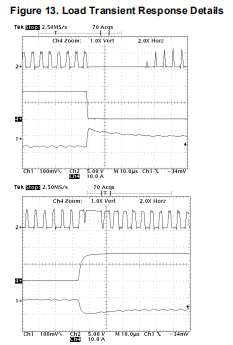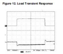 图12显示了演示板对加载的响应瞬时应用。施加的负载瞬态输出电流从0A变为14A(通道4)。可以观察到,输出电压(通道1)在整个调节电压。图13显示了有关电流上升和下降时的电路响应可以观察到相位信号(信道2)上升到100%或必要时降低至0%。