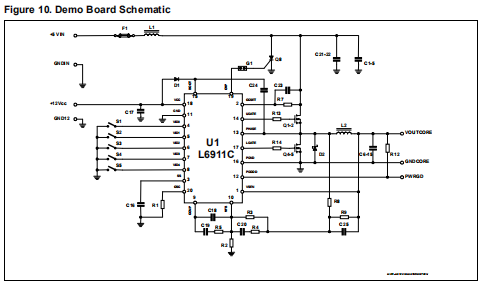 L6911C演示板显示了标准VRM 8.4应用程序中设备的操作。本次评估电路板允许通过开关S1-S5调节电压(1.3V-3.5V)和高输出电流能力(高达14A)。设备由12V输入轨供电,而电源转换从5V输入轨开始。该设备还能够在5V电源电压下工作;在这种情况下,12V输入可以直接连接到5V电源。四层演示板的铜厚度为70μm,以尽量减少传导考虑到电路能够传输的高电流,损耗。图10显示了演示板的自动电路。