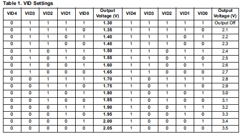 内置的数模转换器允许将输出电压从1.30V调整到2.05V50mV二进制步进,2.10V到3.50V,100mV二进制步进,如前表1所示。这个对内部基准进行了微调,以确保1%的精度。调节的内部参考电压由电压识别(VID)引脚编程。这些是内部DAC的TTL兼容输入,通过提供内部参考电压的一系列电阻实现。VID代码驱动多路复用器,该多路复用器在分隔线的点。DAC输出被传送到获得VPROG参考电压的放大器(即误差放大器的设定值)。提供内部上拉(通过5μa电流发生器实现);在这种情况下这样,编程逻辑“1”就足够让引脚浮动,而编程逻辑“0”就足够短了引脚接地。电压识别(VID)引脚配置还设置功率良好阈值(PGOOD)和过压保护(OVP)阈值。VID代码“11111”禁用该设备(作为SS引脚上的短路),并且不调节输出电压。