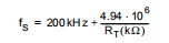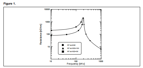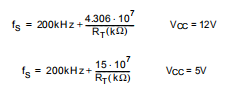 将RT连接到VCC=12V或VCC=5V时,频率降低(电流被强制进入引脚),根据与以下关系: