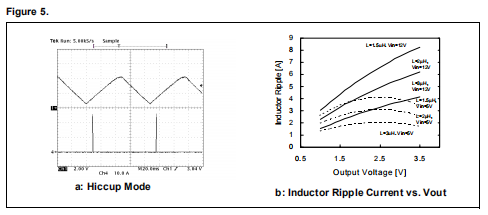 在输出短路的情况下,软启动电容器以恒定电流(10μA典型值)放电,以及SS引脚达到0.5V软启动阶段重新启动。在软启动过程中,过流保护始终处于活动状态,如果发生此类事件,设备将关闭两个MOSFET,SS电容器将再次断电(在达到约4V的上限值之后)。系统现在在“打嗝”模式下工作,如图5a所示,在排除过流原因后,装置重新正常工作电源开关。