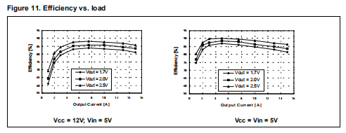 图11显示了不同输出电压值下测量的效率与负载电流的关系。措施对于不同的输出电压值(2.05V和2.75V),在Vin=5V下进行。两种不同的测量方法采用5V和12V的集成电路供电。在应用中,两个并联的MOSFET STS12NF30L(30V,10mΩ典型值@Vgs=4.5V)用于不管是低的还是高的。该电路板已经被布置成可能使用多达三个SO8 MOSFET的高和低侧开关。两个D2也可使用封装MOSFET(高低压侧各一个),以便最大限度地满足不同要求的灵活性。