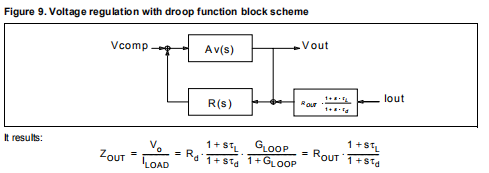 如图6所示,ESR降在任何情况下都存在,但使用降速函数,则输出电压最小。实际上,降速功能引入了与输出电流成比例的静态误差(图6中的Vdroop)。由于不存在感应电阻,因此使用电感的固有电阻(几个mΩ)。因此,在反馈信号中加入低通滤波电感电压(即电感电流),以简单的方式实现下垂功能。指的是如图7所示,闭环系统的静态特性为:
