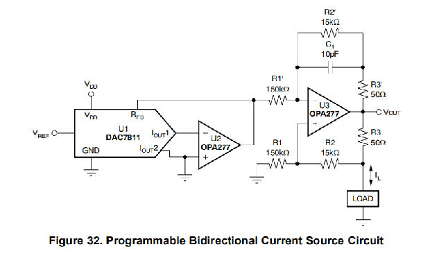 DAC7811可以集成到图32中的电路中,以实现改进的吼叫电流泵,用于精确的电压-电流转换。电路具有双向电流和高电压合规性。对于匹配的电阻网络,电路的负载电流如等式3所示: