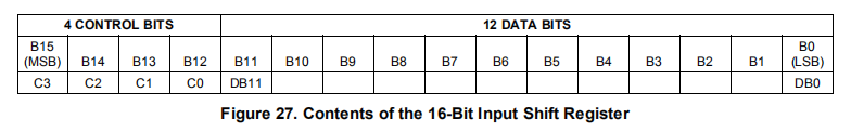 输入移位寄存器的宽度为16位,如图27所示。四个MSB是控制位C3–C0;这些位决定在菊花链模式下的同步上升沿或独立模式下的第16个活动时钟边缘执行哪个功能。剩下的12位是数据位。在加载和更新命令(C3–C0=0001)中,这12个数据位将被传输到DAC寄存器;否则,它们将不起作用。