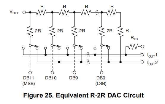 DAC7811是一个单通道,电流输出,12位数模转换器(DAC)。该体系结构,如图25所示,是一个R-2R梯形图配置,其中有三个MSB分段。梯形图的每个2R支腿要么切换到IOUT1或IOUT2端子。DAC的IOUT1端子通过使用外部I/V转换器运算放大器保持在虚拟GND电位。R-2R梯形图连接到确定DAC满标度电流的外部参考输入VREF。R-2R梯形图对10kΩ±20%的外部参考提供了与代码无关的负载阻抗。外部参考电压可以在-15V到+15V的范围内变化,从而提供双极性输入电流操作。通过使用外部I/V转换器和DAC7811 RFB电阻器,可以生成–VREF到VREF的输出电压范围。