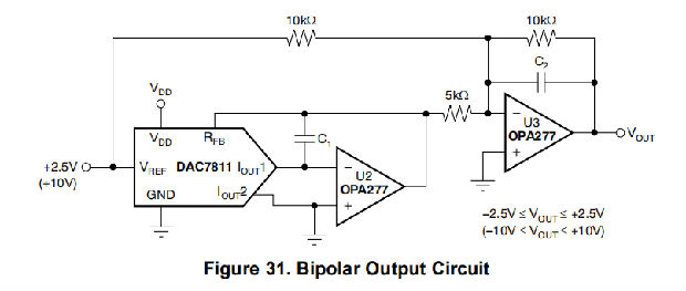 为了获得DAC7811的最佳线性性能,建议使用低偏移电压运算放大器(如OPA277)(见图26)。该电路允许VREF从-10V摆动到+10V。