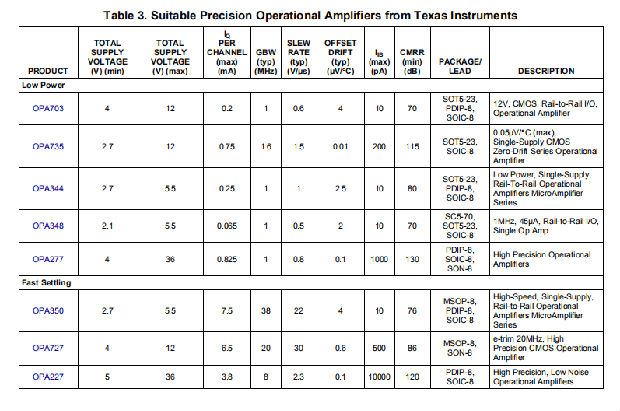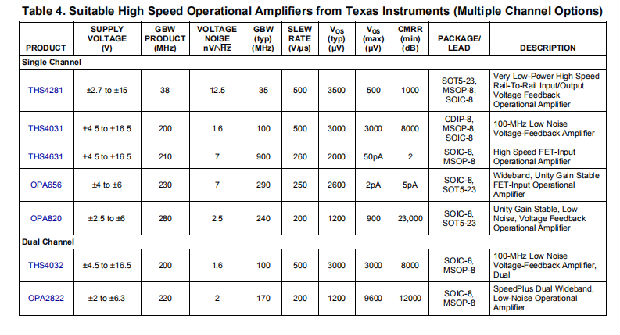 对于乘法数模转换器(MDAC)而言,选择合适的运算放大器有许多选择,也有许多不同之处。利用MDAC产生模拟信号是一个关键的方面。然而,也有其他问题需要考虑,如放大器噪声,输入偏置电流,偏置电压,以及MDAC分辨率和故障能量。表3和表4给出了一些适合于低功耗、快速稳定和高速应用的运算放大器。