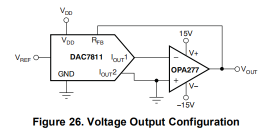 当使用外部I/V转换器和DAC7811 RFB电阻器时,DAC输出电压由方程式1给出: