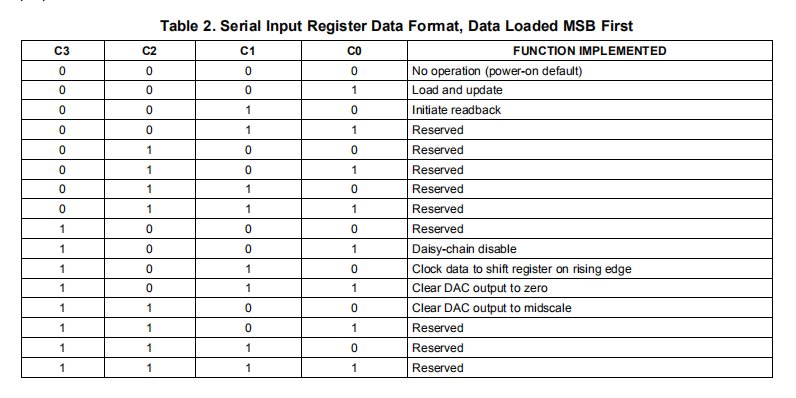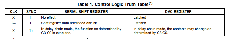 当同步被调高时,每个设备将执行其输入移位寄存器中由四个DAC控制位C3-C0定义的功能。例如,链中要用新数据更新的每个DAC的C3-C0必须为0001,而链中内容保持不变的每个DAC的C3-C0必须为0000。