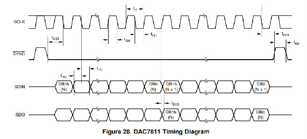 DAC7811以菊花链模式通电,当两个或多个设备串联连接时,必须使用菊花链模式。当第一个设备的SDO输出连接到下一个设备的SDIN输入时,SCLK和SYNC信号在所有设备上共享,以此类推。在此配置中,链中的每个DAC7811需要16个SCLK周期。请参考图28的时序图。