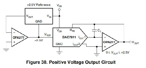 如图30所示,为了产生正电压输出,将负参考输入到DAC7811。由于电阻公差误差,建议采用这种设计,而不是使用反向放大器来反转输出。对于负参考,参考电压的VOUT和GND电平移到虚拟接地,并通过运算放大器向DAC7811提供-2.5V输入。