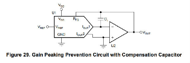 对于电流-电压设计(见图29),DAC7811电流输出(IOUT)和与运算放大器逆变节点的连接应尽可能短,并符合正确的印刷电路板(PCB)布局设计实践。对于每个代码更改,都有一个步骤函数。如果运算放大器的增益带宽积(GBP)有限,并且反向节点的寄生电容过大,则增益峰值是可能的。因此,为了电路的稳定性,可以在设计中添加补偿电容器C1(1pF到5pF,典型值),如图29所示。