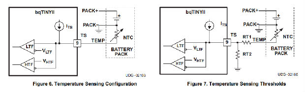 bqTINY II通过测量TS和VSS引脚之间的电压来持续监测电池温度。内部电流源为常见的10-kΩ负温度系数热敏电阻(NTC)提供偏置(见图6)。该设备将TS引脚上的电压与内部V(LTF)和V(HTF)阈值进行比较,以确定是否允许充电。如果检测到超过V(LTF)和V(HTF)阈值的温度,设备会通过关闭功率FET并保持计时器值(即计时器未复位)立即暂停充电。当温度恢复到正常范围内时,充电恢复。