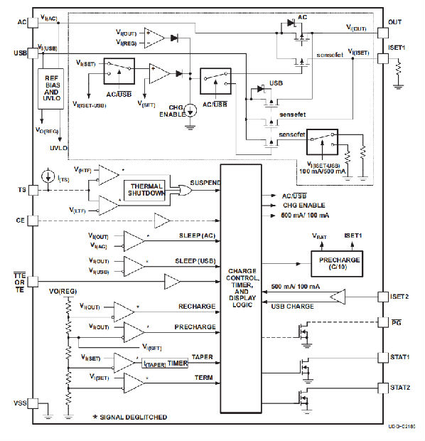 ISET1和VSS之间连接的电阻RSET决定交流输入的锥度检测电平。对于USB充电,锥形电平固定在100或500毫安充电率的10%。