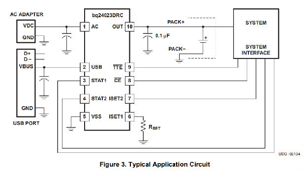 bqTINY II自动选择USB端口或交流适配器作为系统的电源。在USB配置中,主机可以从100毫安或500毫安的两种预设费率中进行选择。在交流适配器配置中,外部电阻器设置系统或充电电流。
