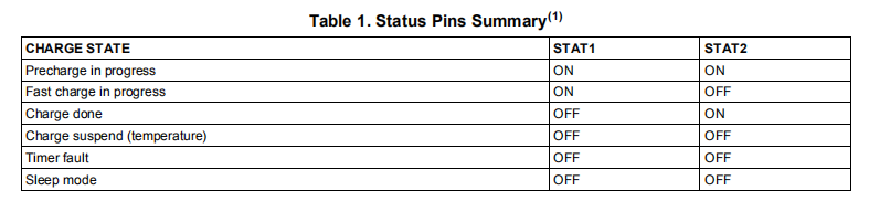 开路漏极STAT1和STAT2输出指示各种充电器操作,如下表所示。这些状态引脚可用于驱动LED或与主机处理器通信。注意,关表示开漏晶体管关断。
