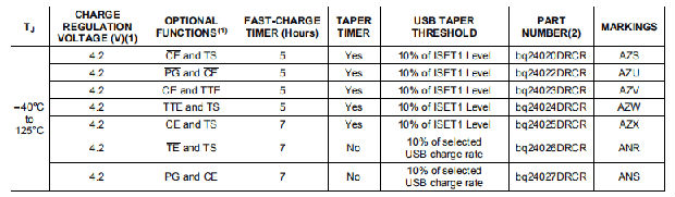 bq24026和bq24027在电压调节阶段监测充电电流。一旦检测到锥形阈值I(锥形),bq24026/27终止电荷。此版本没有锥度计时器(t(锥度))。
