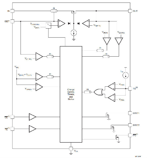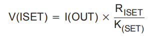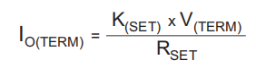 该设备提供片上电流调节和可编程设定点。连接在ISET和VSS之间的电阻RSET决定了充电速率。规格表中指定了V(SET)和K(SET)参数。