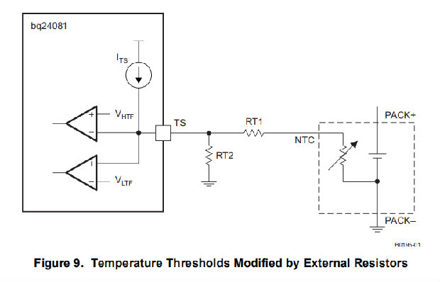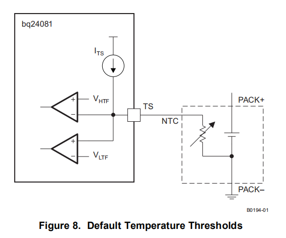 bq24081通过测量TS和VSS引脚之间的电压来持续监控电池温度。