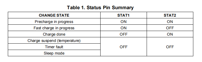 开路漏极STAT1和STAT2输出指示各种充电器操作,如下表所示。这些状态引脚可用于驱动LED或与主机处理器通信。注意,关表示开漏晶体管关断。