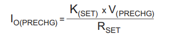 在充电周期中,如果电池电压低于V(低V)阈值,设备会向电池施加预充电电流IO(PRECHG)。这一特性使深放电的细胞复活。连接在ISET和VSS之间的电阻RSET决定了预充电率。V(PRECHG)和K(SET)参数在电气特性表中指定。