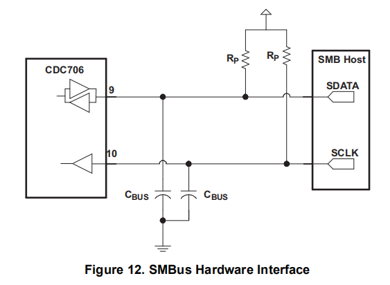 下图显示了CDC706时钟合成器如何连接到SMBU。注意,通过上拉电阻器(Rp)的电流必须满足SMBus规格(最小100μA,最大350μA)。如果CDC706未连接到SMBus,SDATA和SCLK输入必须与10 kΩ电阻器连接到VCC,以避免浮动输入条件。