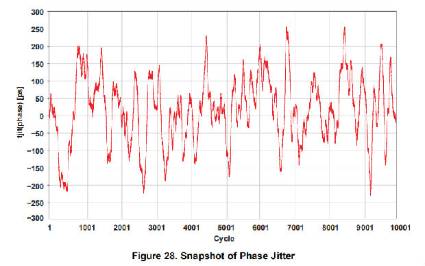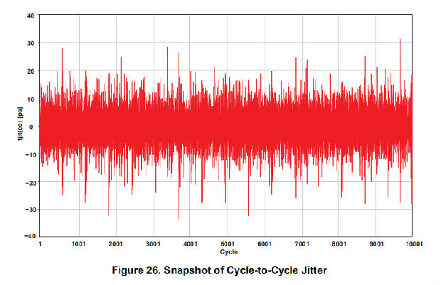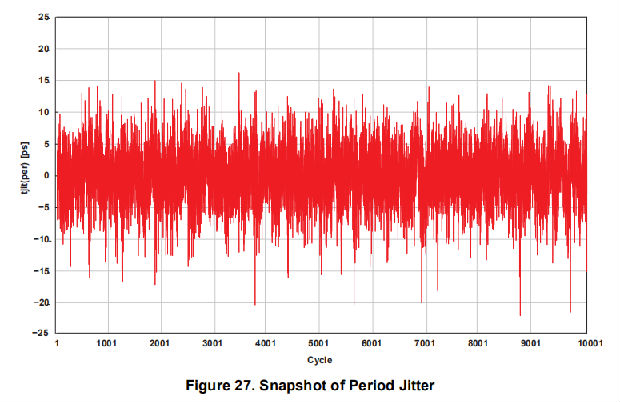 图26、图27和图28显示了10000个样本的周期到周期抖动、周期抖动和相位抖动之间的关系。抖动随采样窗口变小或变宽而变化。周期间抖动和周期抖动显示测量值,而相位抖动是累积的周期抖动。