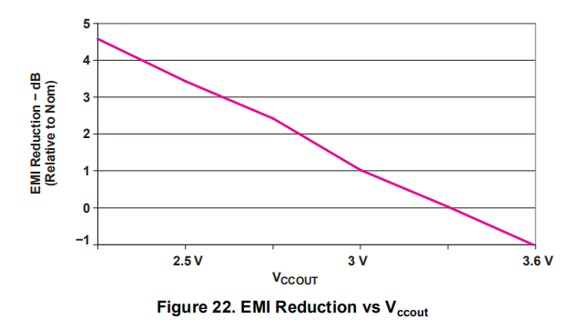 如图21和图22所示,较慢的输出转换率和/或更小的输出信号幅度有助于更大程度地降低EMI发射。这两种措施都降低了时钟谐波的射频能量。CDC706允许在0.6ns到3.3ns(字节19-24,位[5:4])之间分四步进行转换率控制。输出振幅由两个独立的输出电源电压引脚VCCOUT1和VCCOUT2设置,范围从2.3伏到3.6伏不等。即使是低至1.8伏的输出电源电压也能工作,但必须考虑最大频率。