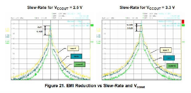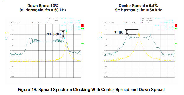 在高速应用中,SSC是降低电磁干扰(EMI)噪声的有效方法。它通过调制频率来降低时钟信号的射频能量峰值,并将信号的能量扩展到更宽的频率范围。因为时钟信号的能量保持不变,所以使泛音变宽的频率必然会降低泛音的振幅。图19显示了SSC对DSP 54 MHz时钟信号的影响。