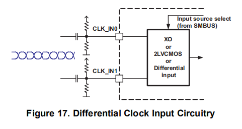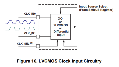 当选择LVCMOS时钟模式时,CLK iu IN0和CLK_IN1作为常规时钟输入引脚,可以驱动到200兆赫。两个时钟输入电路在设计上是相等的,可以相互独立使用(见图16)。内部时钟选择位字节10位[4]选择两个输入时钟中的一个。CLK_IN0是默认选择。也可以选择将外部控制引脚S0/CLK_SEL编程为时钟选择引脚,字节10,位[1:0]。