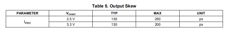 偏差是时钟分布电路的一个重要参数。它被定义为由同一输入时钟驱动的输出之间的时间差。表5显示了CDC706在整个电源电压、工作温度和输出电压摆动范围内的高-低和低-高转换的输出偏差(tsk(o))。