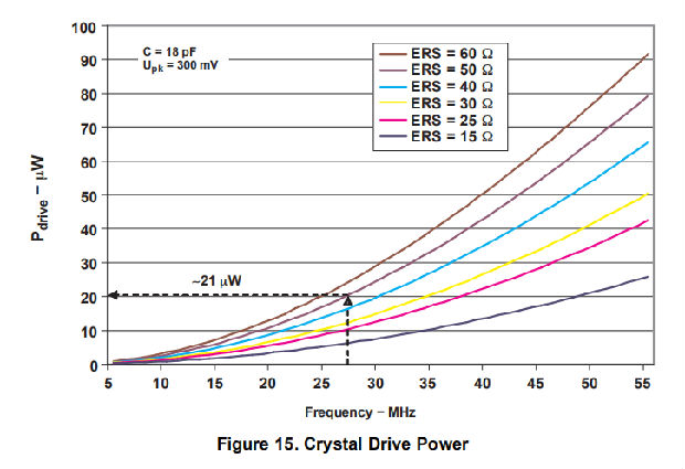 例如,如果使用ESR为50Ω的27 MHz晶体,2 x CL为18 pF,则驱动功率为21μW。应将驱动电平保持在最小值,以避免过度驱动晶体。在振荡器规范中,为每种类型的晶体规定了最大功耗,即,对于上述示例,为100μW。