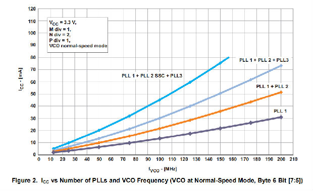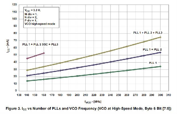 PLL支持正常速度模式(80MHz≤fVCO≤200MHz)和高速模式(180MHz≤fVCO≤300MHz),可由PLLxFVCO选择(字节6的位[7:5])。各自的速度选项确保稳定的运行和最低的抖动。