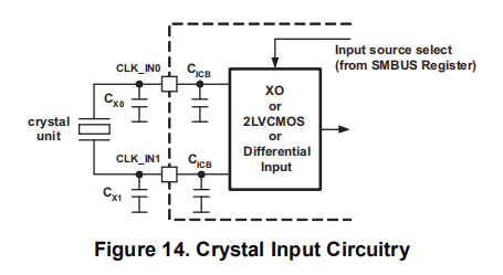 晶体模式的输入频率范围为8mhz~54mhz。CDC706使用皮尔斯型振荡器电路,其中包含用于反相放大器的反馈电阻。然而,用户必须添加外部电容器CX0,CX1)以匹配晶体的输入负载电容器(参见图14)。可以计算所需值:
