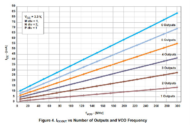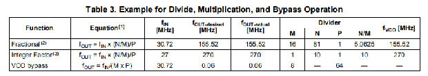 分频器M和分频器N在内部作为fVCO的分频器工作,最高可达250 MHz。这允许分频比为零ppm输出时钟误差。