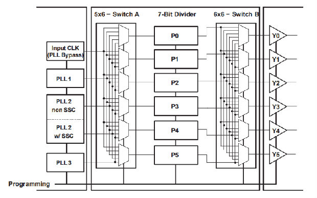 输出开关矩阵的灵活结构允许用户通过自由选择的后分频器将任何内部时钟信号源切换到六个输出中的任何一个。