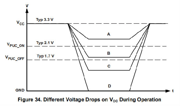 在电源电压下降的情况下,通电电路确保寄存器中始终有一个定义的设置。图34显示了不同幅度的可能电压降。