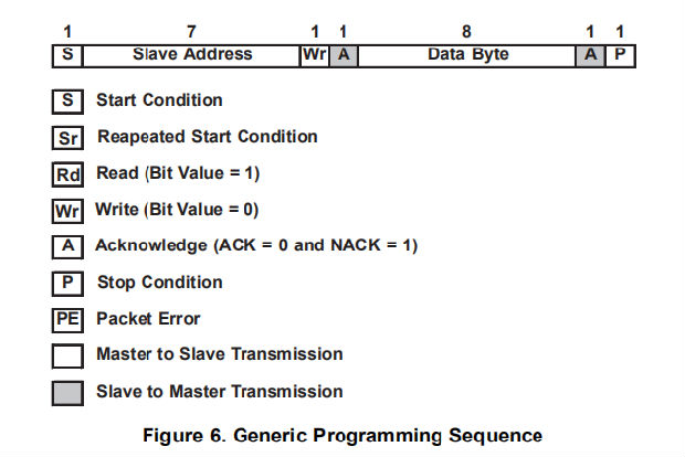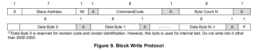 对于块写/读操作,字节必须按从最低字节到最高字节(最高有效位在前)的顺序访问,并能在传输完任何完整字节后停止。对于字节写入和字节读取操作,系统控制器可以访问单独寻址的字节。