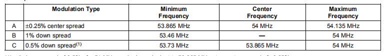 在SSC模式下,用户可以选择SSC调制量和SSC调制频率。调制量是基于载波的频率偏差(最小/最大频率),而调制频率决定频率变化的速度。在SSC模式下,最大VCO频率限制为167 MHz。