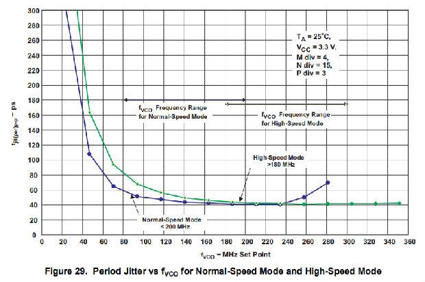 由于CDC706支持相当宽的频率范围,该设备提供了VCO频率选择位,即字节6的位[7:5]。该位定义每个PLL的抖动优化频率范围。用户可以在正常速度模式(80 MHz到200 MHz)和高速模式(180 MHz到300 MHz)之间进行选择。图29显示了fVCO在两个频率范围内的抖动性能。