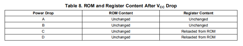 CDC706通电电路有一个内置的迟滞。如果电压保持在VPUC_OFF以上(通常为1.7 V),寄存器内容保持不变。如果电压降到VPUC U OFF以下,内部寄存器在VPUC U ON再次交叉后由ROM重新加载。VPUC_ON通常为2.1V。表8显示了上述电压下降后ROM和寄存器的内容。