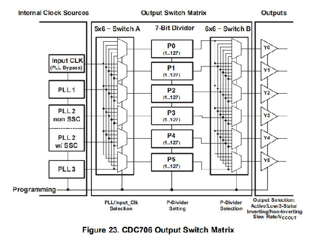 如图23所示,CDC706基于两组交换机和六个柱式分配器。开关A包括六个5输入MUX,它们选择四个PLL时钟输出中的一个,或者直接选择输入时钟并将其馈送给7位后分频器(P分频器)中的一个。开关B由6个6输入MUX组成,它接受任何后分频器,并将其馈送给6个输出之一Yx。